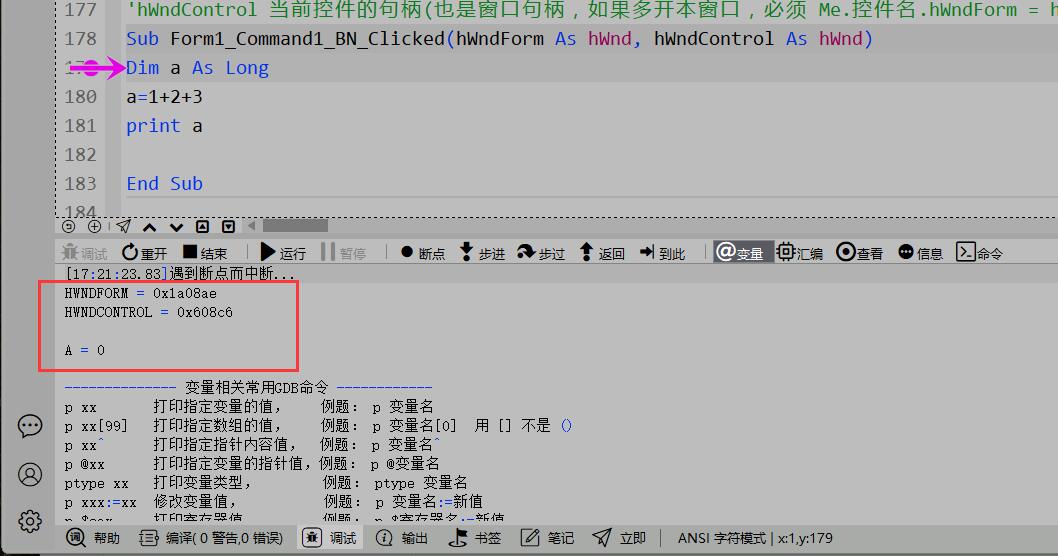 - 当代码执行到这一行时,软件将会中断,停在这一行,等待你操作,可以点【步进】或【步过】。
