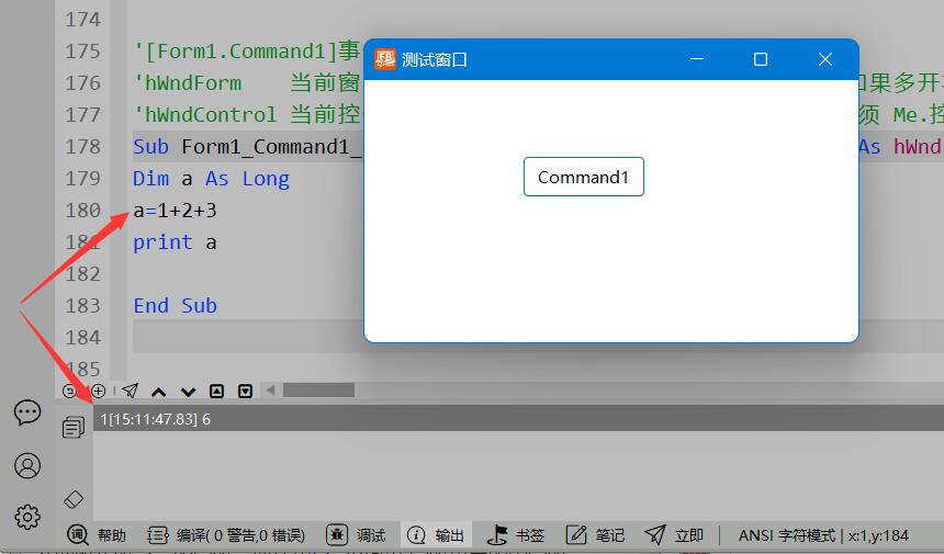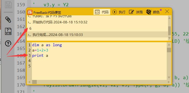 在 VisualFreeBasic 侧边栏中,打开代码便签,输入代码,按 F5 执行代码,初学代码时,这个工具非常好用
