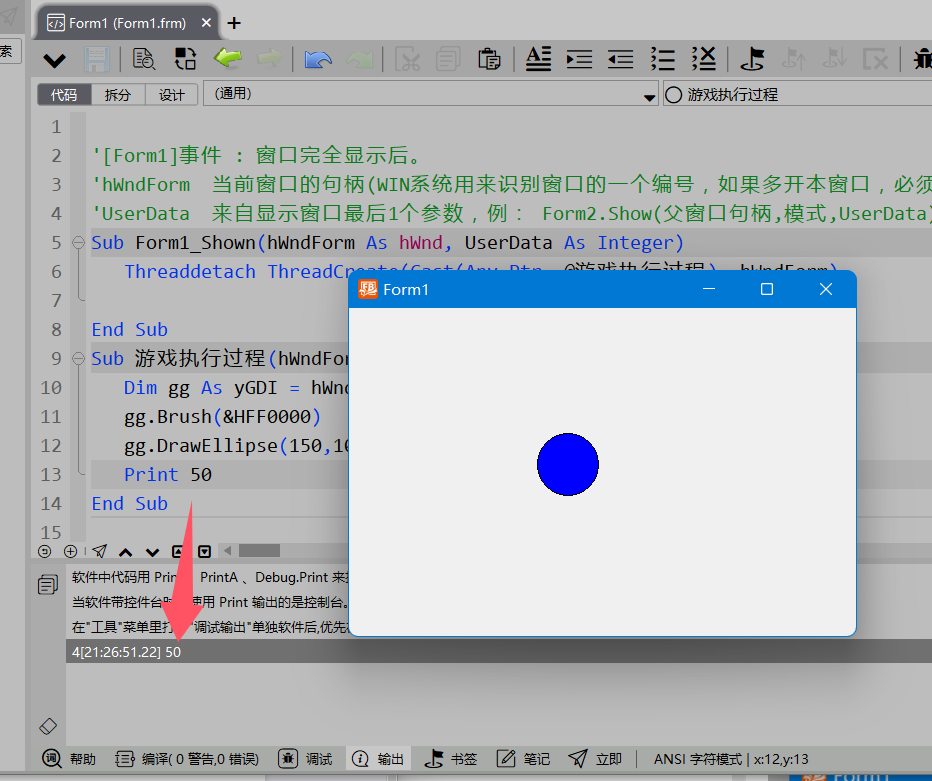 gg.DrawEllipse(150,100,100,100) 中的数字,在FB语言中也称为整数。读者可以尝试修改1-2中代码,绘制出半径小一些的圆,如图所示。