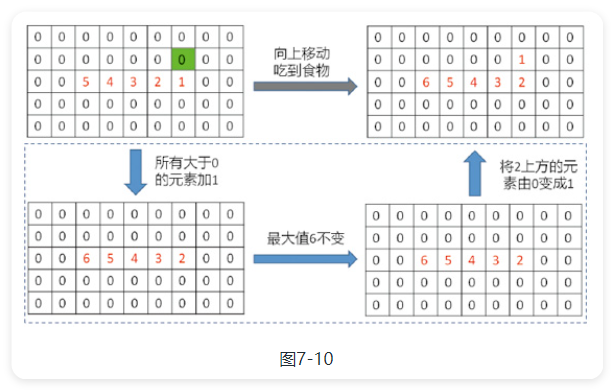 当新蛇头碰到食物时,只需保留原蛇尾,不将最大值变为0,即可让蛇的长度加1,如图7-10所示。