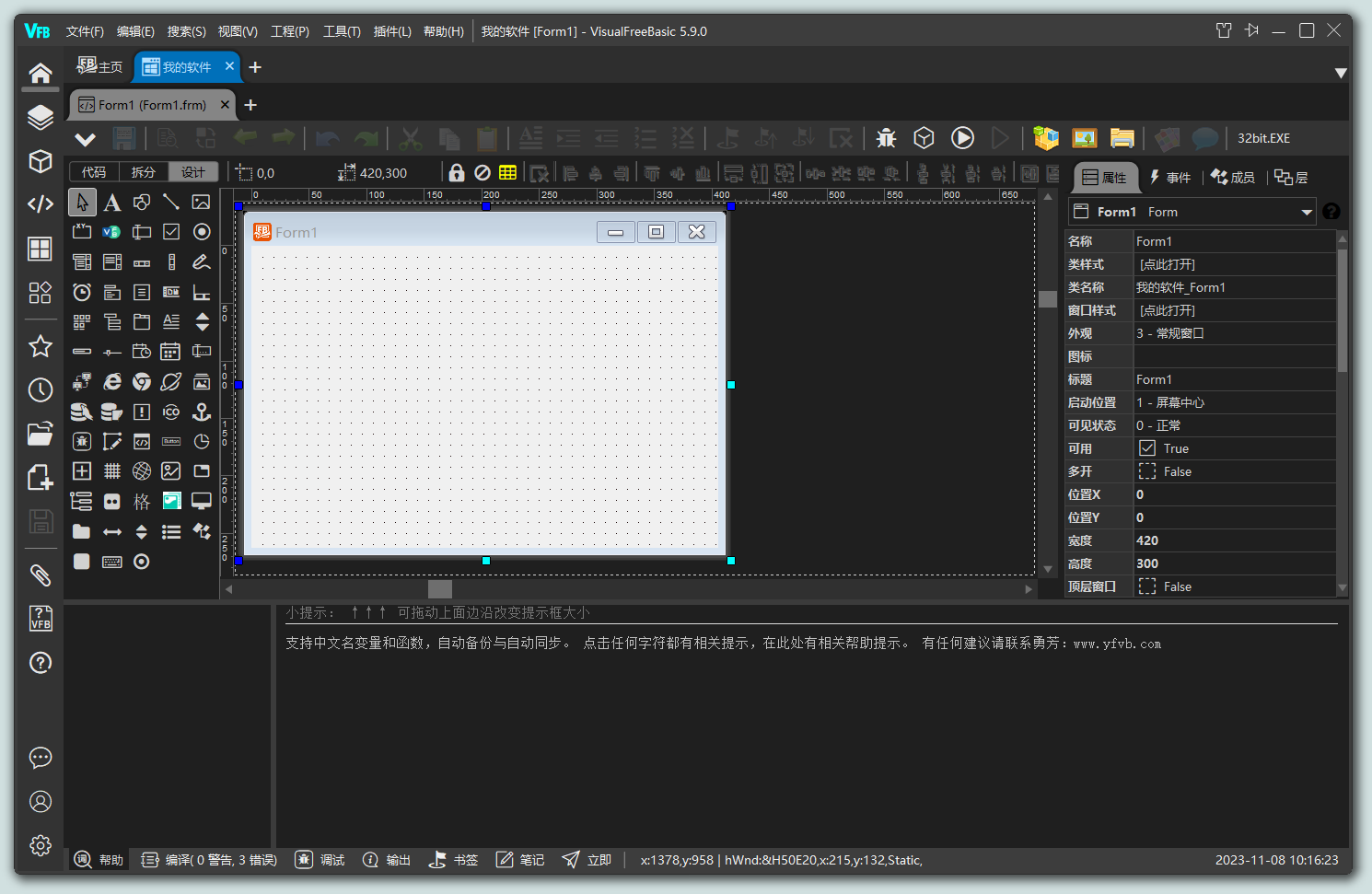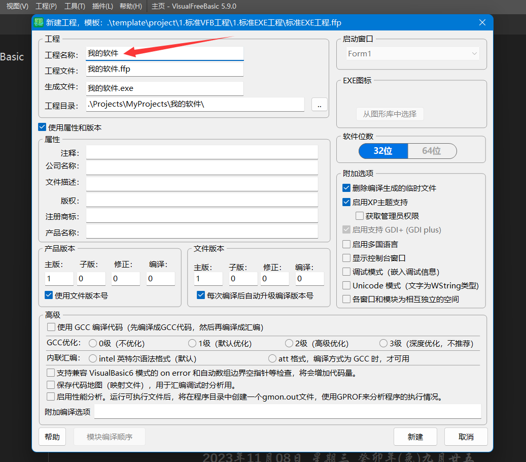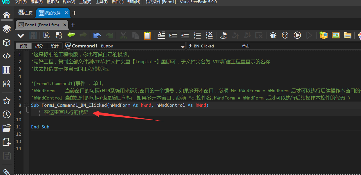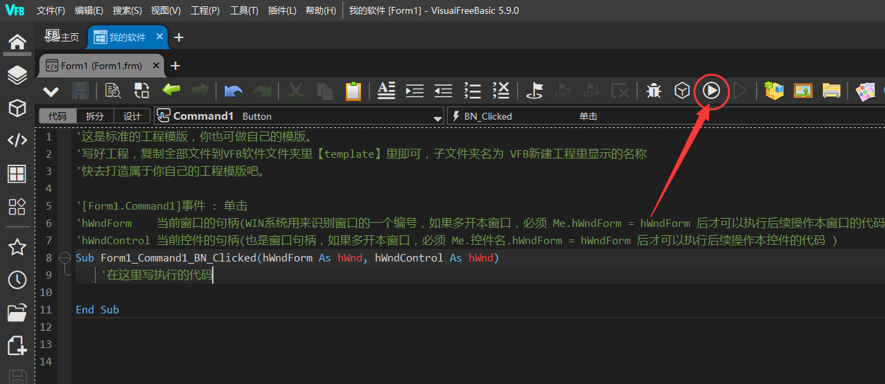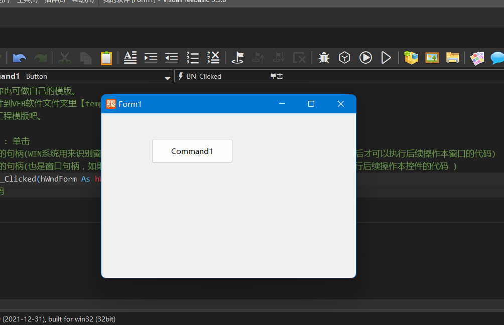 一、新建工程 选择EXE工程 输入自己软件的名称 创建完成的样子 二、拖放控件 控件区选择一个控件 摆上控件 三、编写事件代码 双击控件 编写代码 四、生产软件(编译) 点编译执行 已经运行的软件 五、软件文件 打开工程文件夹 软件输出文件夹 软件文件